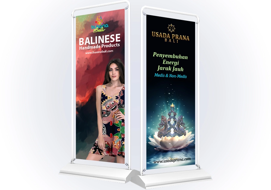 Dengan tampilan yang tinggi dan ramping, banner ini sangat efektif menarik perhatian orang yang lewat.