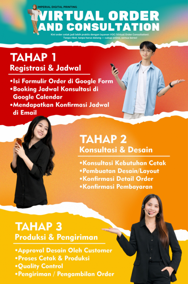 Butuh jasa cetak online Jogja yang cepat dan praktis? Imperial Digital Printing hadir dengan layanan Virtual Order and Consultation untuk konsultasi, desain, produksi, hingga pengiriman secara online.. Selengkapnya..
