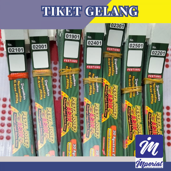 Spesifikasi produk : - Harga tertera pcs - Ukuran tiket gelang : 2 x 23 cm - Bahan LMO syntetic paper - Free Numerator - Hasil cetak Hi-ress - Cetak full color 1 Sisi. - Sudah termasuk double tape (perekat). - Minimal Pembelian 30 Pcs dan belaku kelipatan 30, 60 dst - Bisa custom dengan menggunakan desain sendiri serta bisa custom nama / logo brand