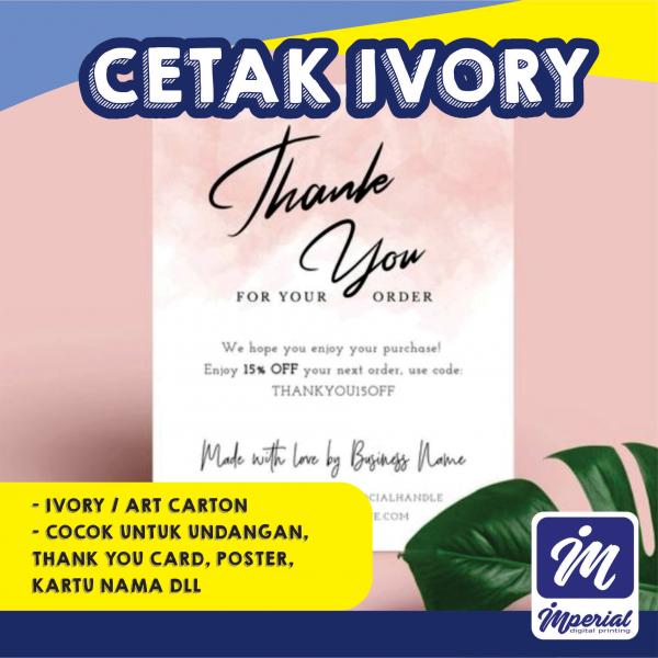 Spesifikasi Ivory : Kertas jenis ivory seperti gabungan dari Art Carton dengan Matt Paper karena memiliki sisi yang berkilauan dan doff di sisi lain. Karena karakteristik inilah kertas ini menjadi populer untuk dijadikan katalog.