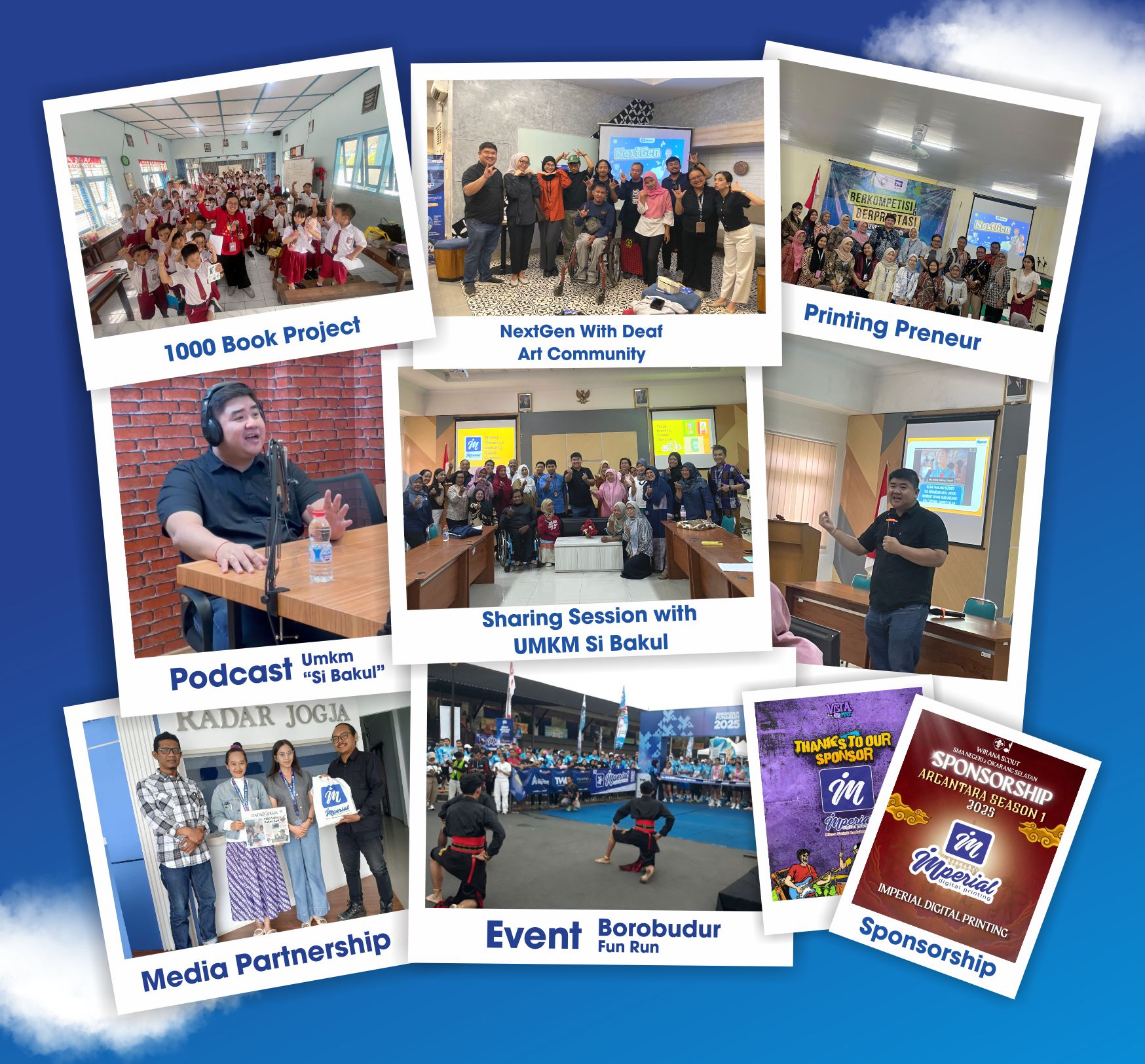Imperial Digital Printing juga dikenal sebagai partner sponsorship bagi berbagai event skala besar maupun kecil di Yogyakarta. Mulai dari pameran, seminar, konser, workshop, hingga kegiatan olahraga, Imperial hadir untuk memberikan dukungan penuh melalui layanan cetak seperti: